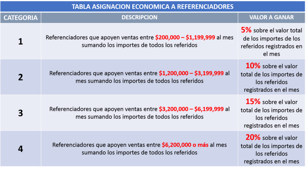 1. El porcentaje correspondiente al valor asignado para el referenciador únicamente se calcula sobre el valor cancelado por cada uno de los referidos, si se aplicó algún descuento este valor no hace parte del porcentaje de comisión.