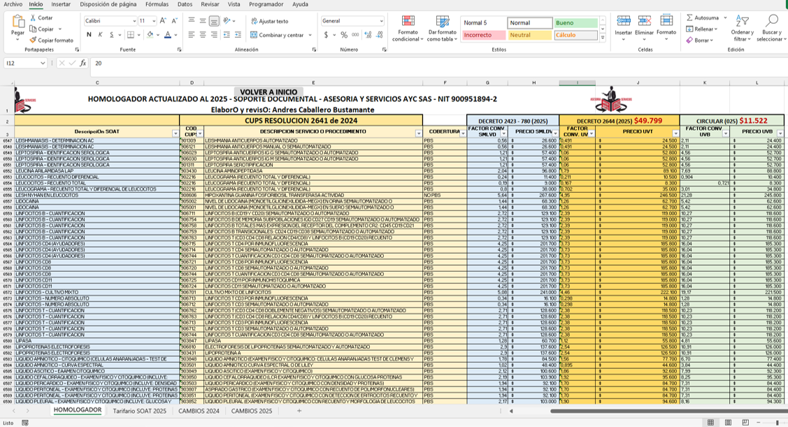 Homologador SOAT actualizado a tarifas UVT decreto 2644 vs códigos CUPS 2025 Resolución 2641 de 2024, en formato de excel